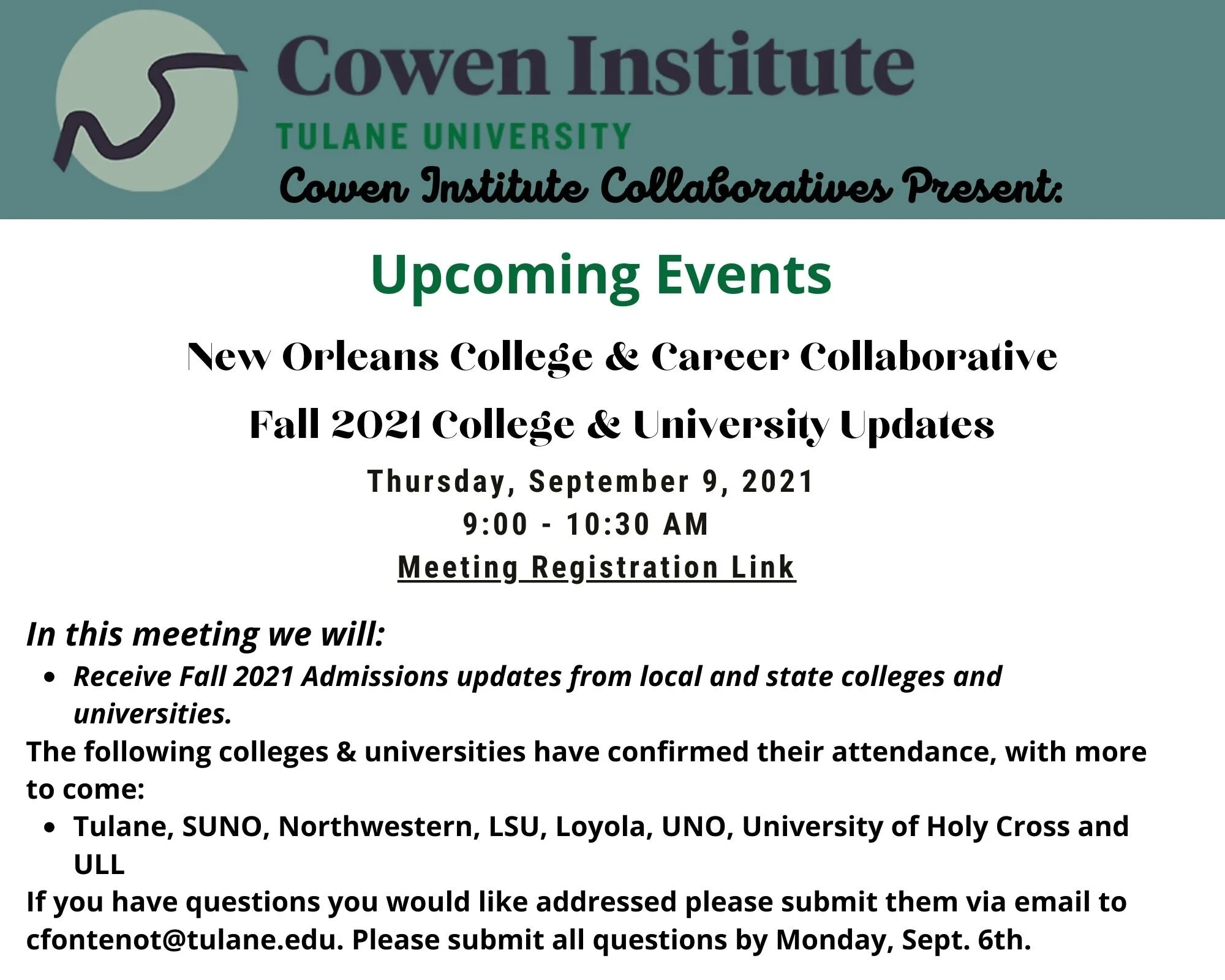 Cowen Collaboratives: Fall 2021 College & University Updates Thursday, September 9, 2021 9:00 AM 10:30 AM Google Calendar ICS
