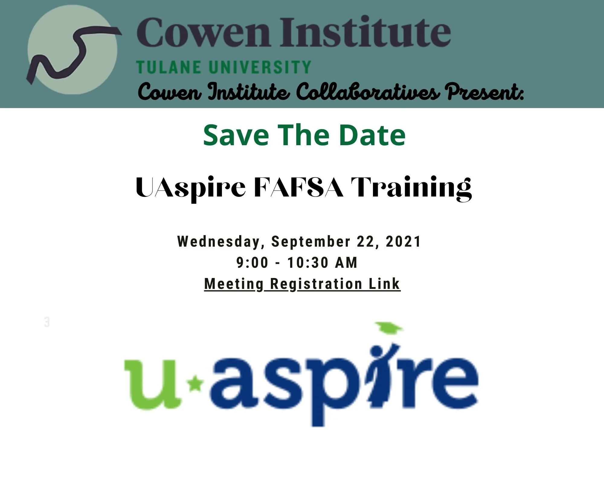 Back to All Events UAspire FAFSA Workshop Wednesday, September 22, 2021 9:00 AM 10:30 AM Google Calendar ICS